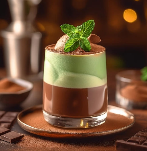 In retro diner, a frosty glass of milk chocolate ganache and peppermint is placed before you. The air is sweet with toasted sugar mint creme and dark cocoa, as a dollop of vanilla ice cream and coconut flakes top off this magical treat